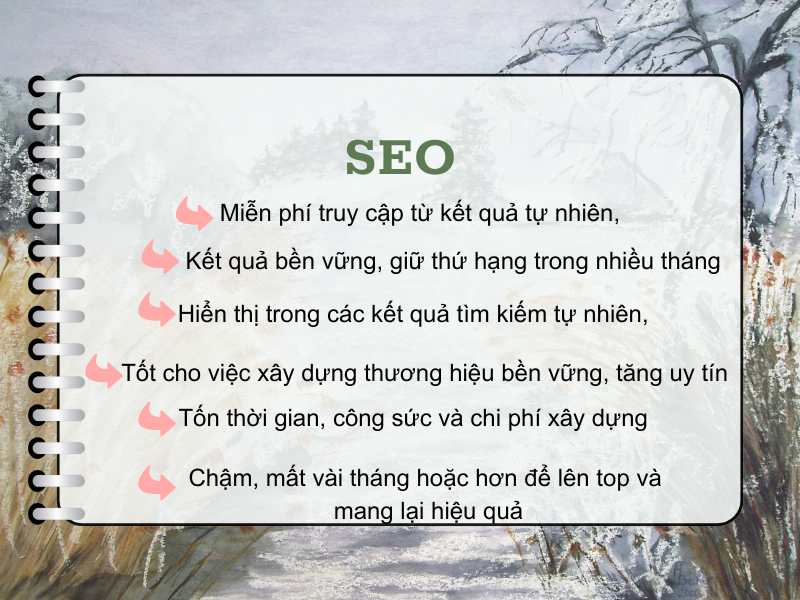 Nếu bạn đã có một chiến lược kinh doanh lâu dài và muốn xây dựng thương hiệu uy tín để có nguồn traffic miễn phí trong tương lai. Và có thể hiện tại bạn đang kinh doanh tốt và chưa cần thúc đẩy doanh số ngay lập tức thì chọn SEO là một hướng đi hiệu quả và giúp bạn tiết kiệm chi phí.